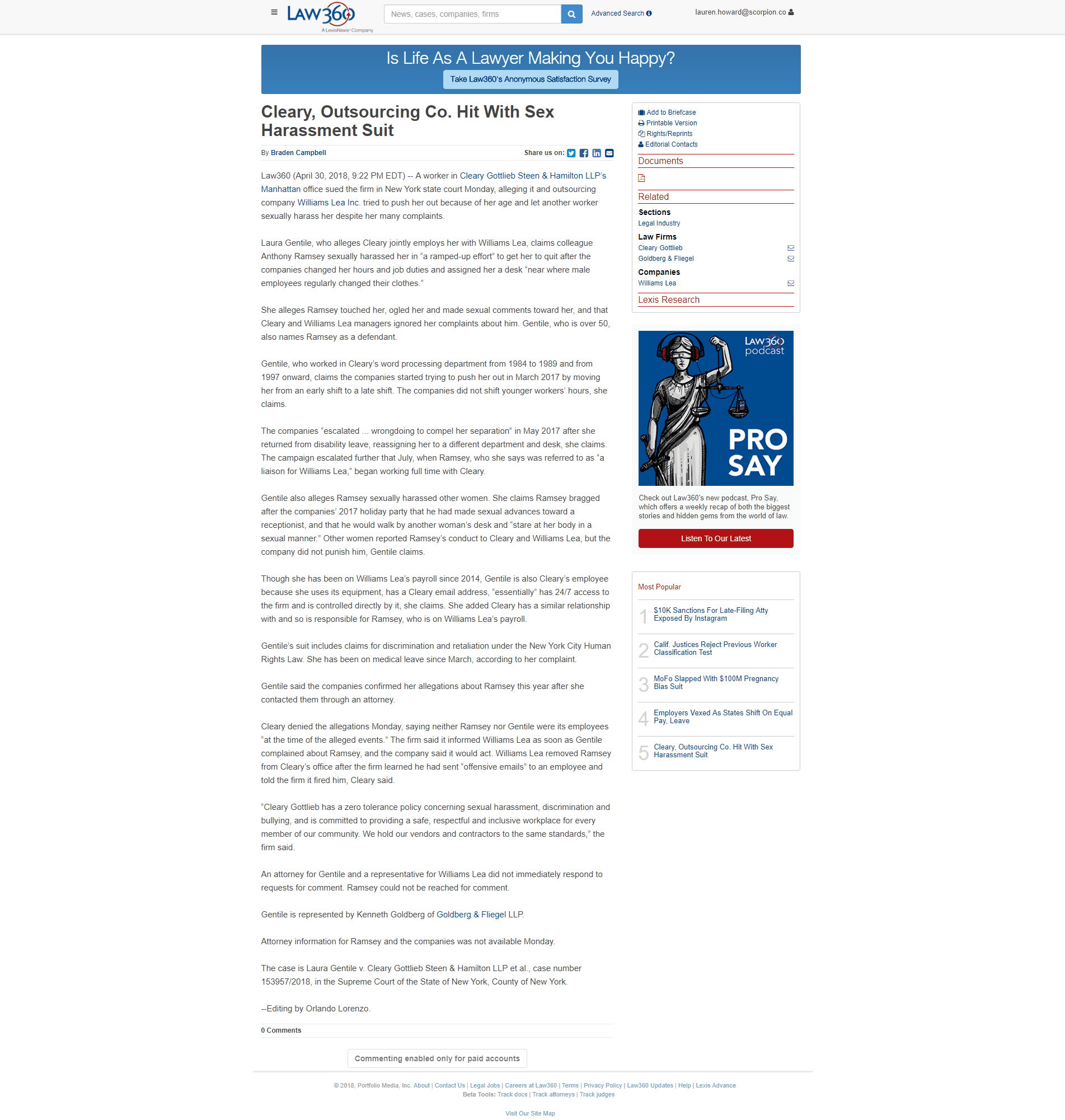 - Cleary Outsourcing Co. Hit With Sex Harassment Suit